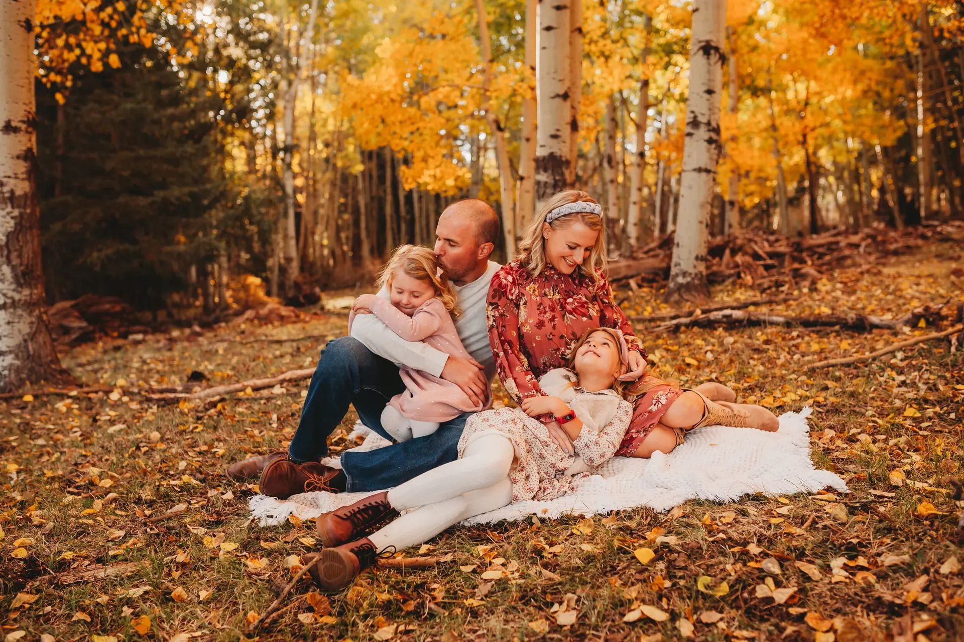 Position your subjects at the edge of tree cover, not directly under it. This gives you Fall context in the frame while avoiding the harsh light patches.